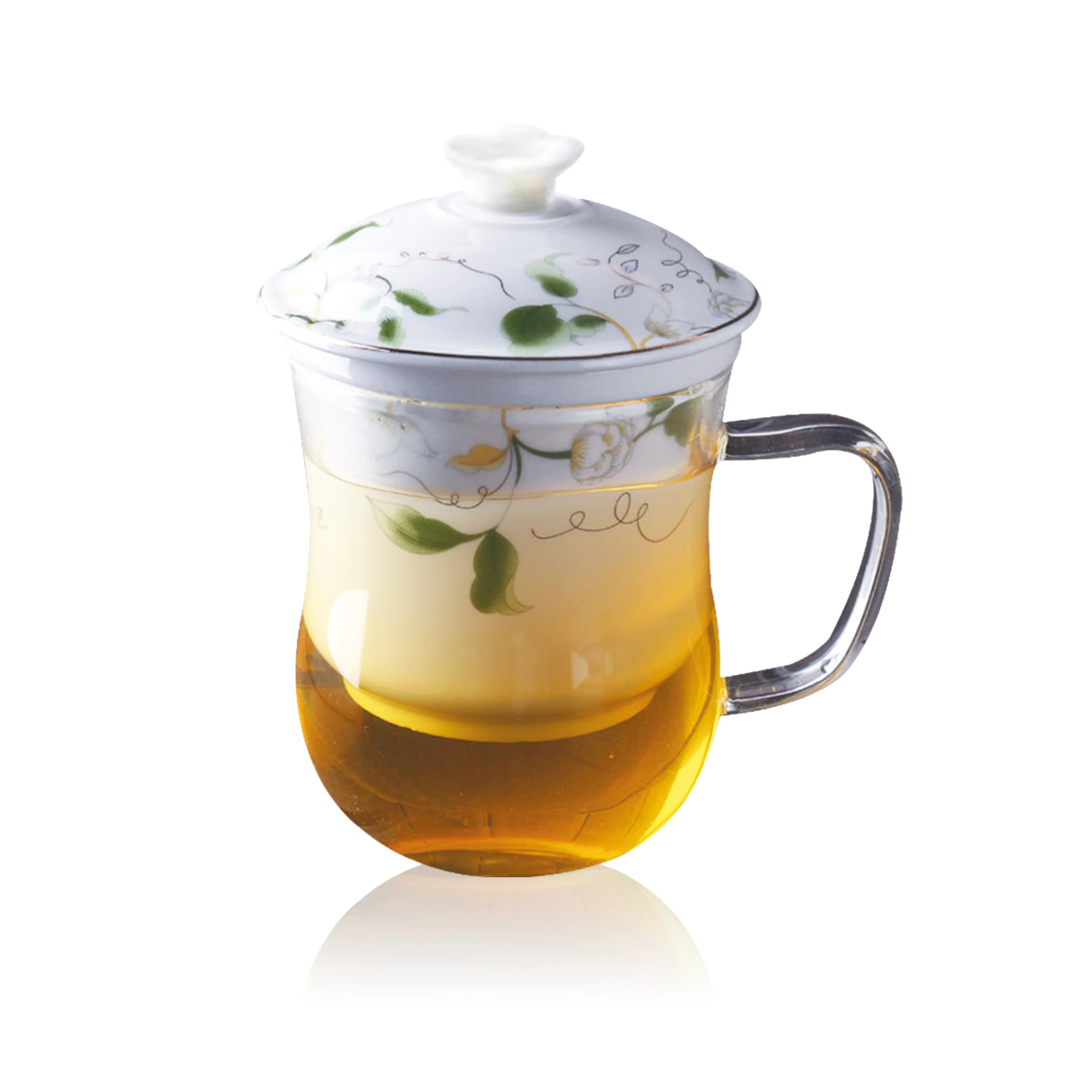 Infuser made of borosilicate glass, a material known for its resistance to thermal shock and corrosion from acidic substances. The removable filter and lid are made of porcelain decorated with floral motifs. Easy to wash, it does not absorb odors and remains unchanged over time. It can be washed in the dishwasher and used on any hob (except induction).