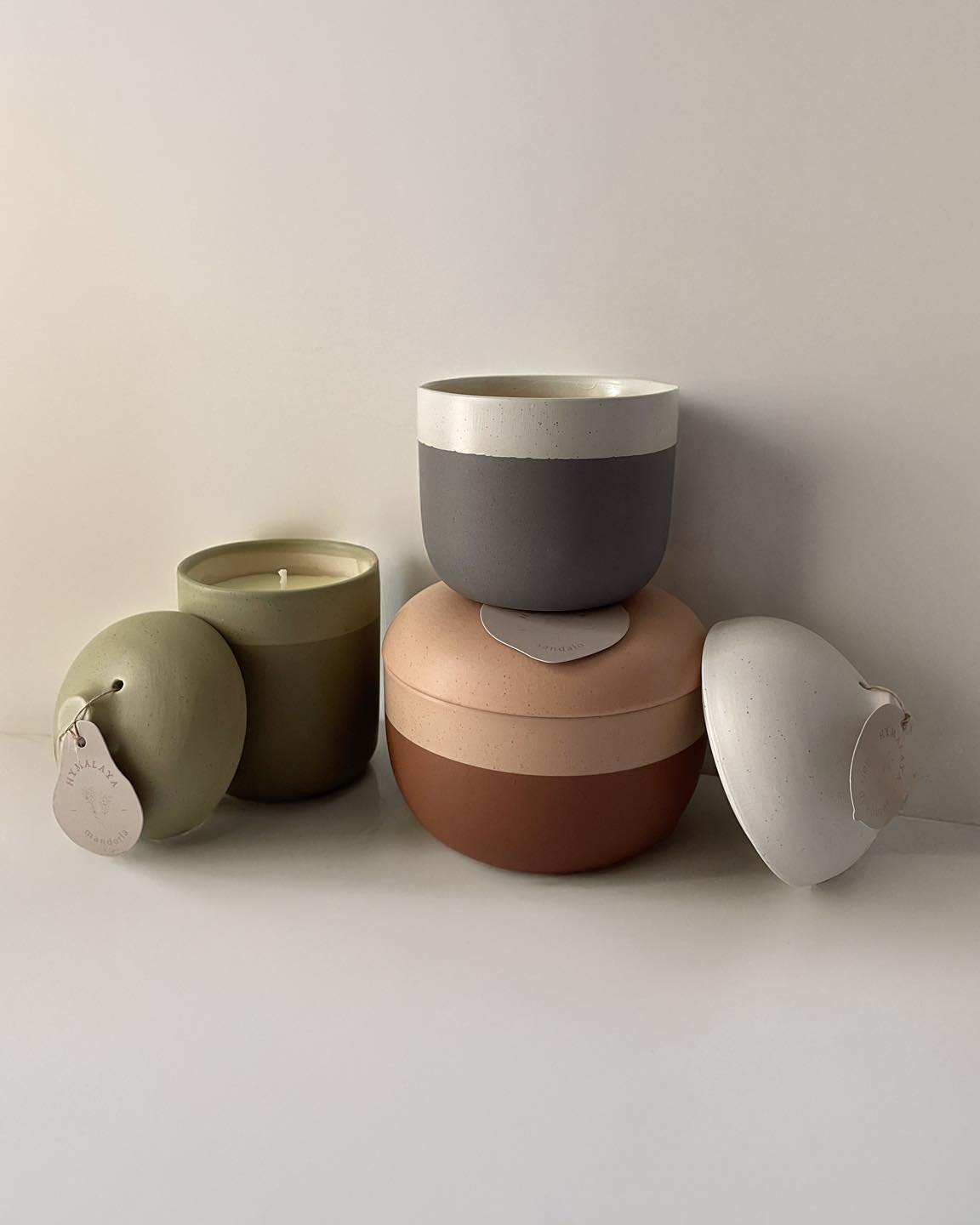 Ceramic cup with lid, cotton wick. Paper packaging.