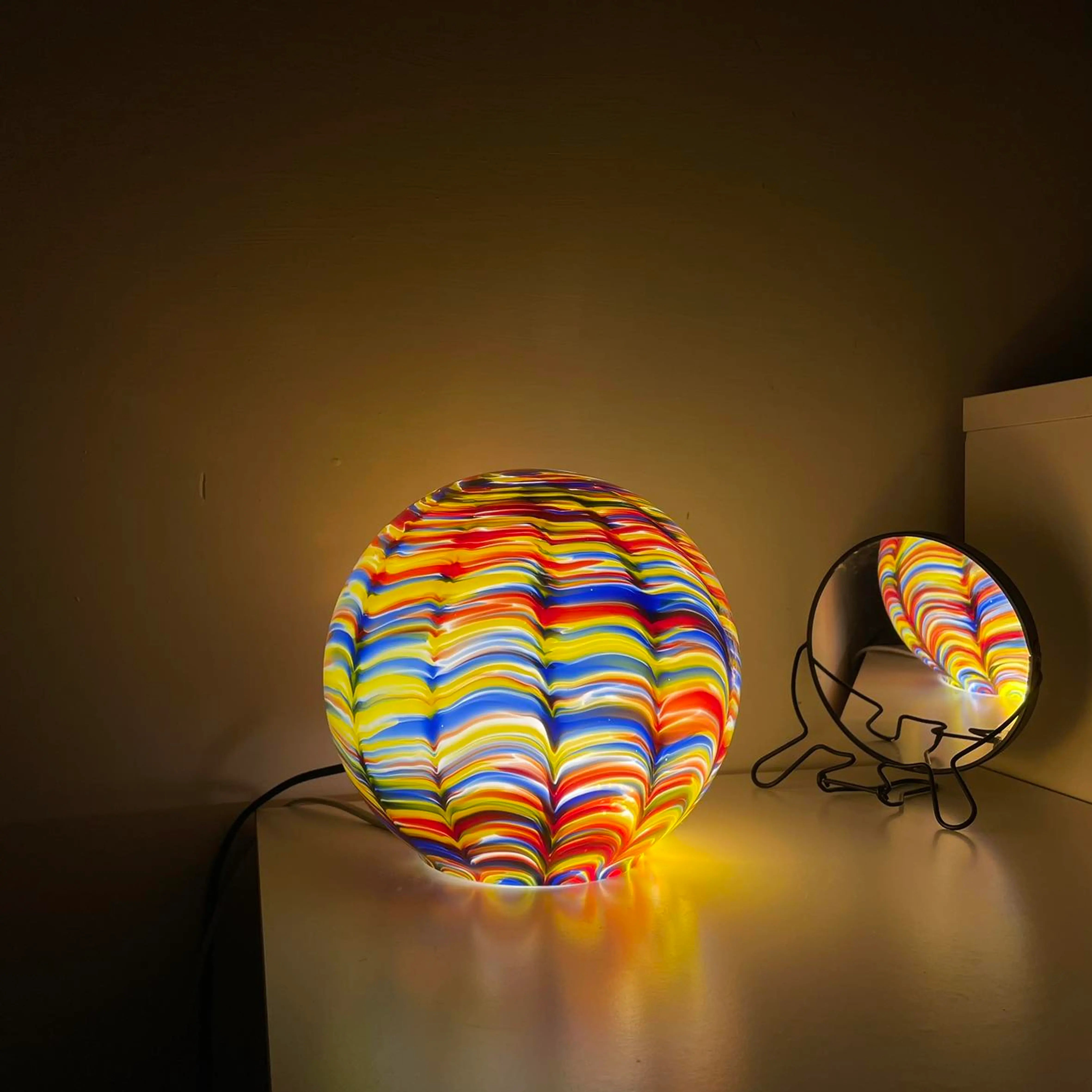 Glass lamp. Paper box.