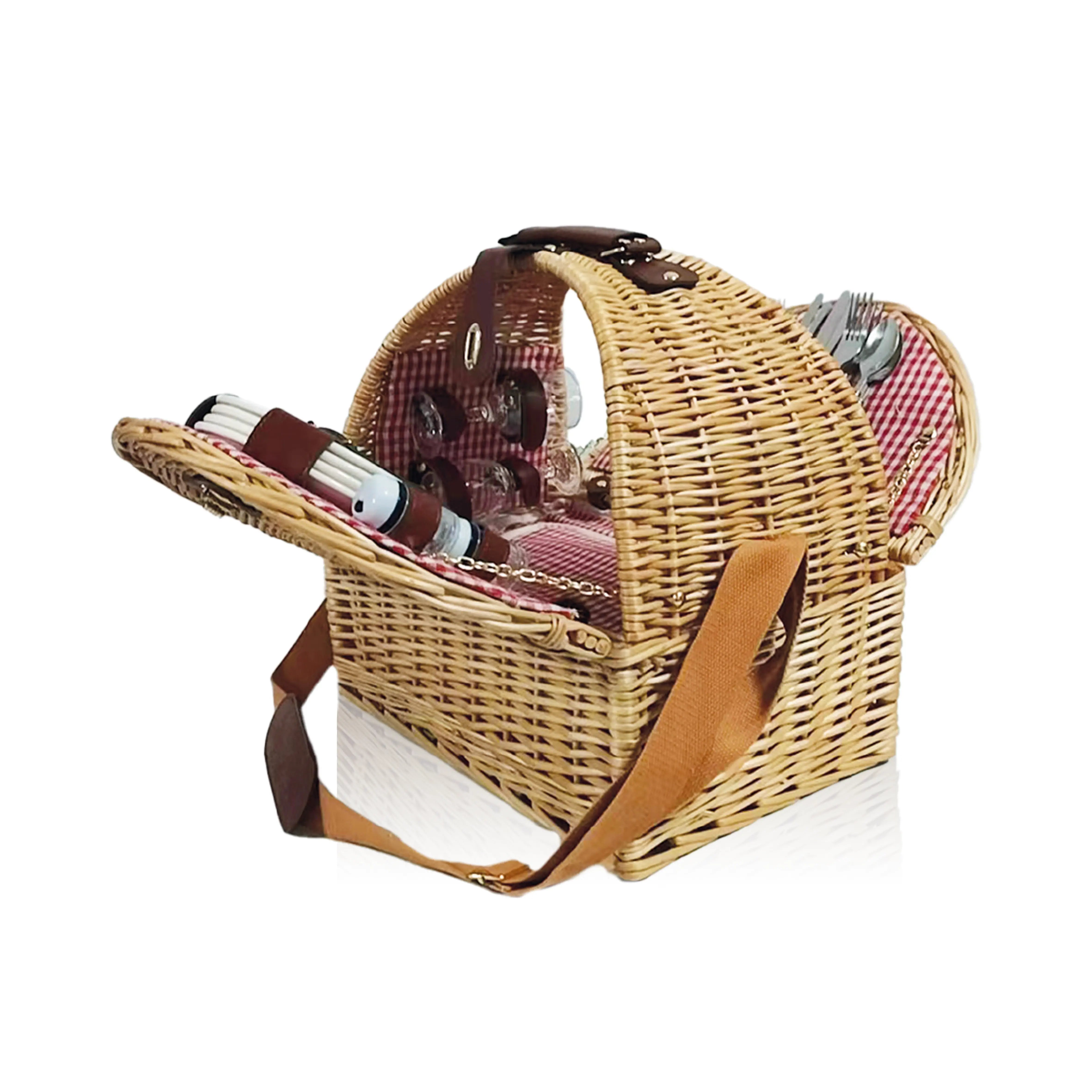 We offer exclusively wooden picnic baskets containing: stainless steel cutlery with PP handles, stainless steel bottle opener with wooden handles, ceramic plates, glass wine glasses, and an internal thermal bag.