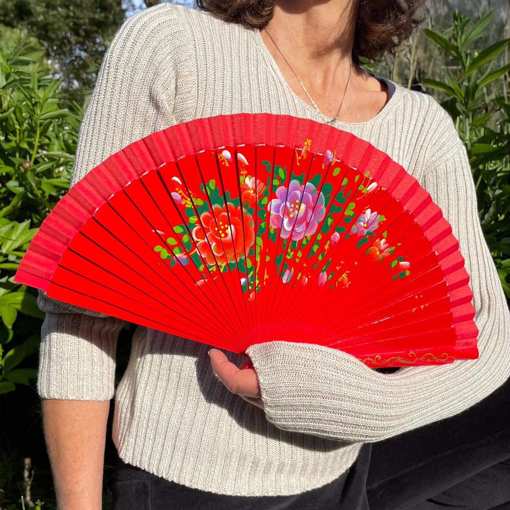 Hand-painted wooden and fabric fan, available in 6 variations and embellished with an elegant package covered in fabric of the same color as the fan: a thought to always carry with you.