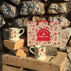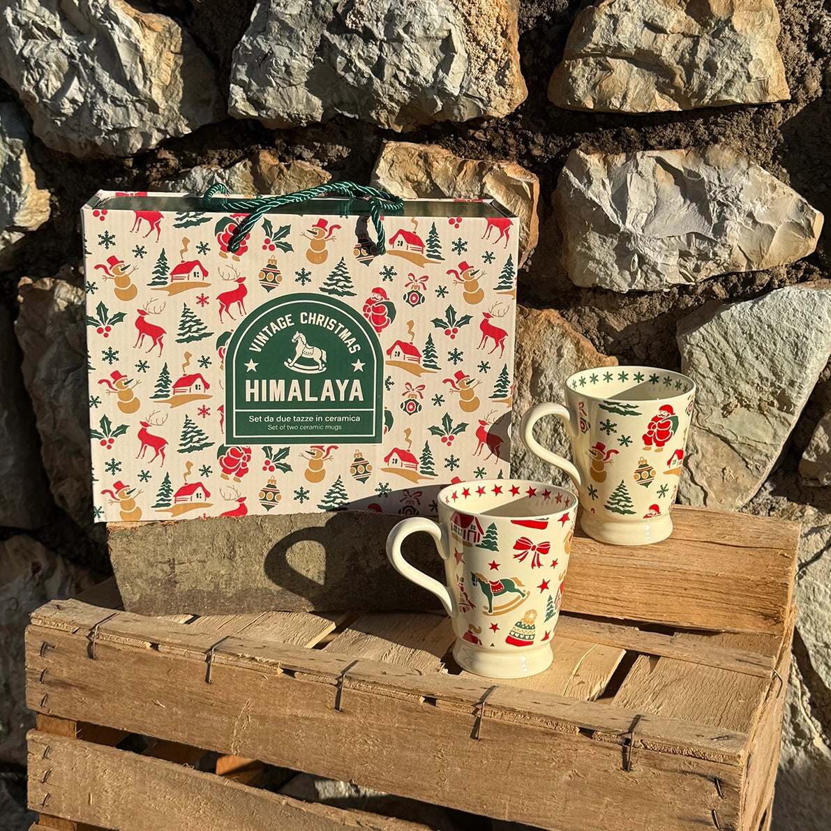 Set of two ceramic mugs decorated with vintage-style Christmas motifs, packaged in a paper gift box with fabric handles. Available in two distinct colors, these mugs evoke the warmth of the holidays and are the perfect Christmas gift.