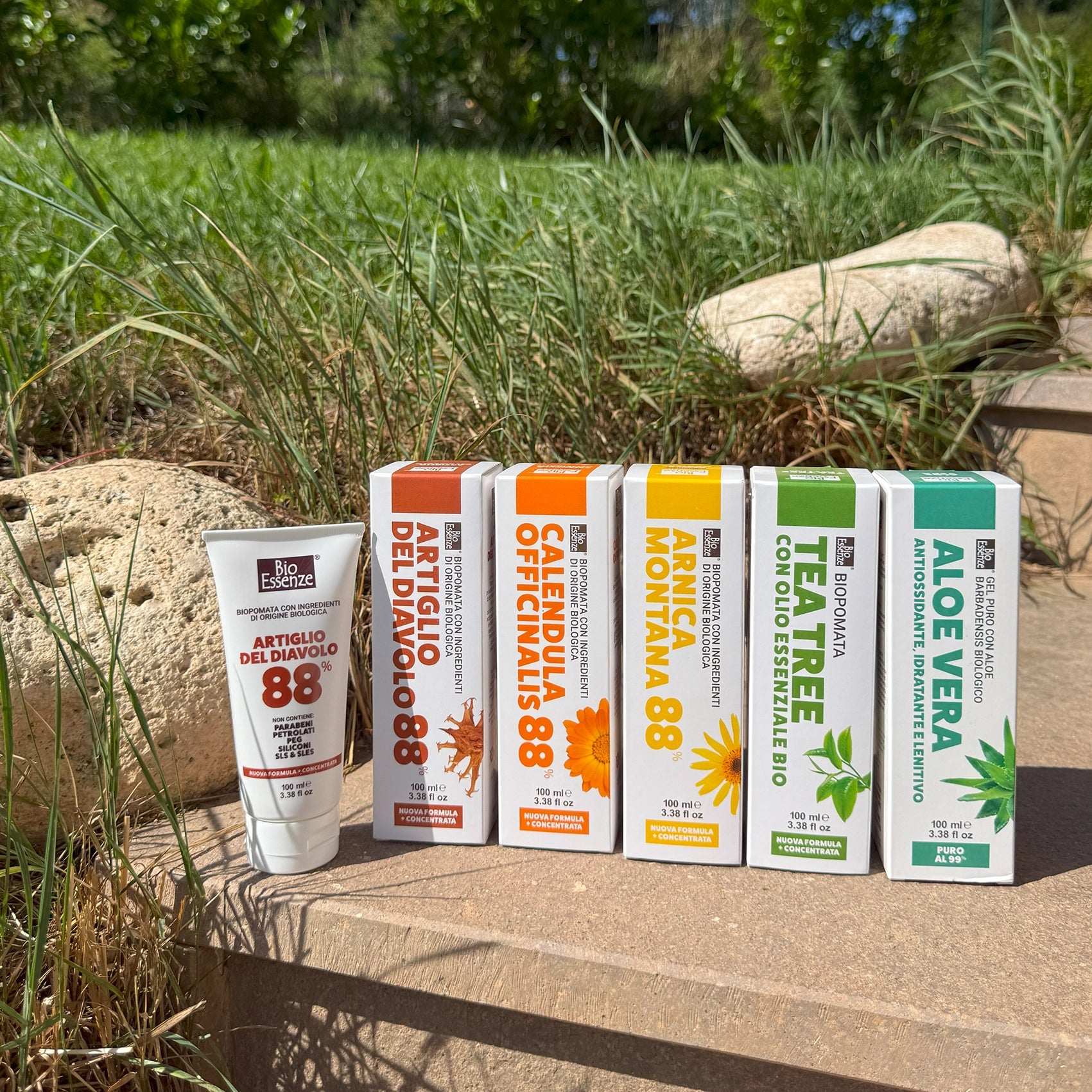 Per difendere la pelle dalle minacce quotidiane e farle ritrovare un benessere naturale e fisiologico, Bio Essenze presenta un prodotto estremamente innovativo: le Biopomate. Realizzate utilizzando piante che vengono da agricoltura biologica, queste pomate si caratterizzano per l’alto contenuto di principi attivi: l'88%, che agisce in sinergia con le qualità degli ingredienti aggiunti. La formula regala una texture piacevole al tatto e delicatamente profumata. Il Gel Aloe Vera contiene Aloe Barbadensis biologico che garantisce un effetto lenitivo, protettivo e rigenerante.