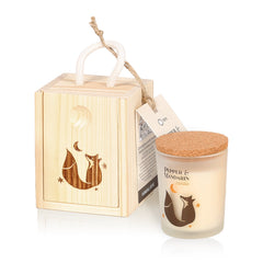 Bicchiere in vetro satinato con stampa, tappo in sughero e stoppino in cotone. Confezione in legno e paglia decorativa all'interno.