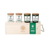 Bicchiere in vetro, tappo in sughero e stoppino in cotone. Confezione in legno e paglia decorativa all'interno.