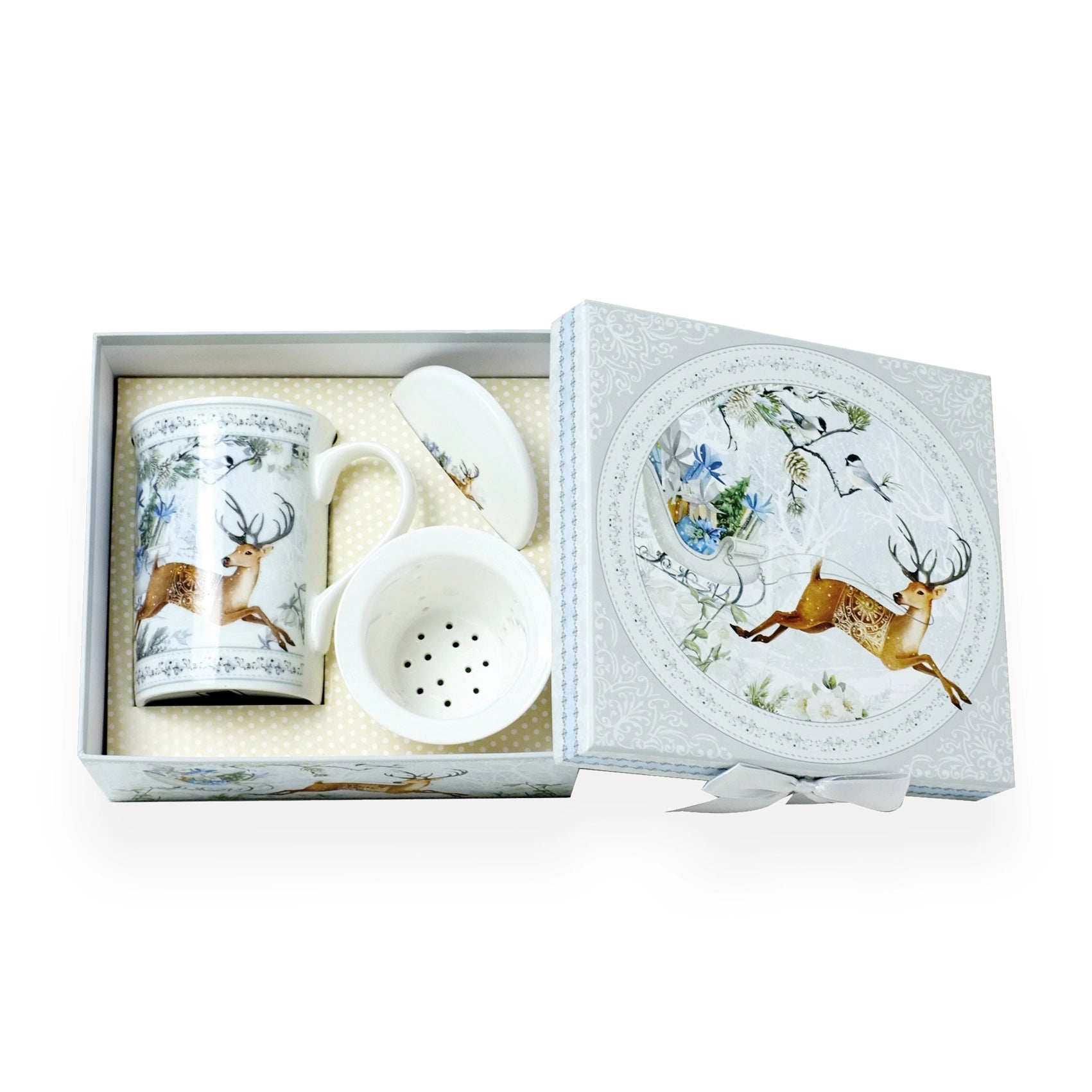 Tisaniera con filtro in porcellana contenuta in una confezione con nastro in stoffa, perfetta per un regalo di Natale.