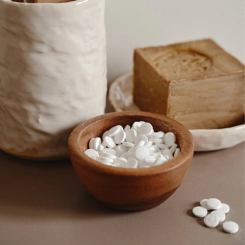 Formato da 180 tavolette: barattolo di vetro^, coperchio di alluminio^, etichetta di carta^*, scatola di cartone^*. ^riciclabile, *compostabile.