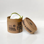 Dischetti in fibra di bambù e cotone. Sacchetto in cotone. Confezione in carta.