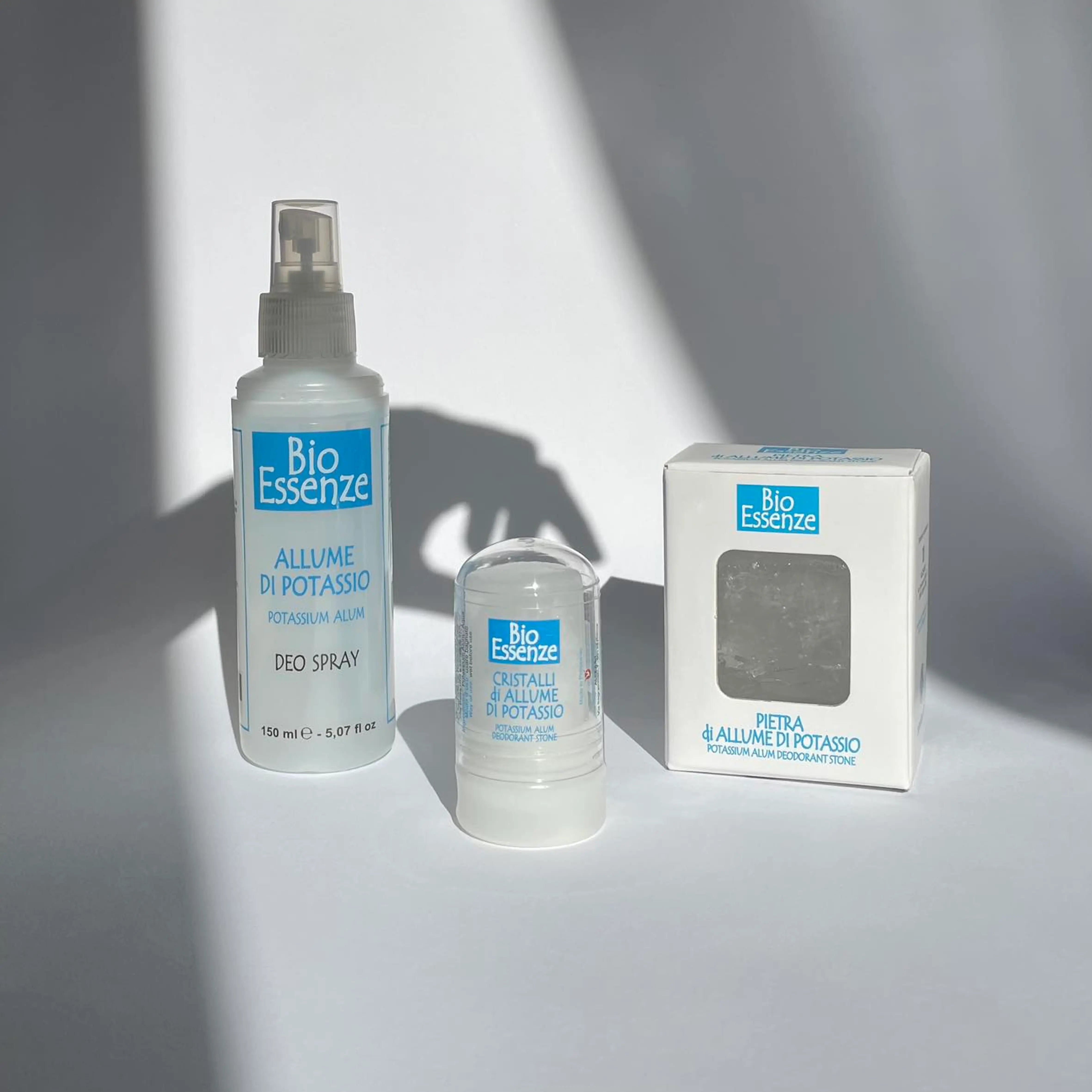 Linea Bio Essenze di deodoranti completamente naturali: l’allume di potassio non contiene gas, cloridrato di alluminio, sostanze chimiche, profumi aggiunti o alcool. Si tratta di un cristallo salino di origine vulcanica con potenti qualità antibatteriche, conosciute fin dall’antichità. Sostituisce efficacemente i classici deodoranti, è un alleato prezioso per ridurre il sudore, anche dei piedi, e permette la traspirazione naturale della pelle, riducendo la probabilità di colonizzazione di batteri che causano i cattivi odori. Non unge, non appiccica e non lascia aloni sui vestiti, neppure su quelli neri. Consigliato anche per pelli sensibili e delicate.
