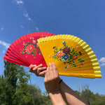 Ventaglio in legno e tessuto dipinto a mano, proposto in 6 varianti e impreziosito da un'elegante confezione rivestita in stoffa dello stesso colore del ventaglio: un pensiero da portare sempre con sé.