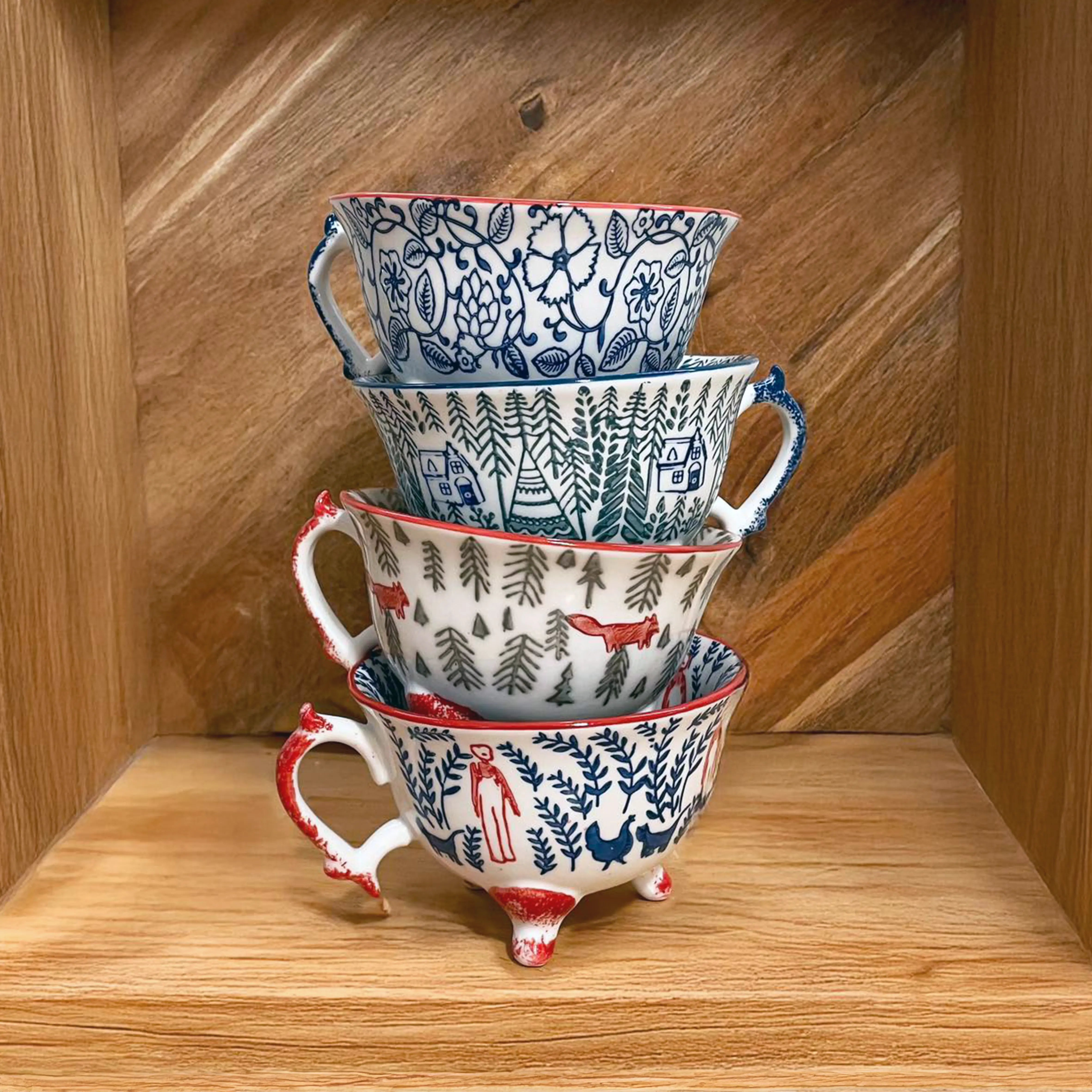Elegant mug è un set di quattro tazze in porcellana dipinte a mano: Flora, Fauna, Guy e Farm. Ogni tazza del set presenta una decorazione unica e originale, frutto di una lavorazione artigianale che le rende perfette per chi ama i dettagli.