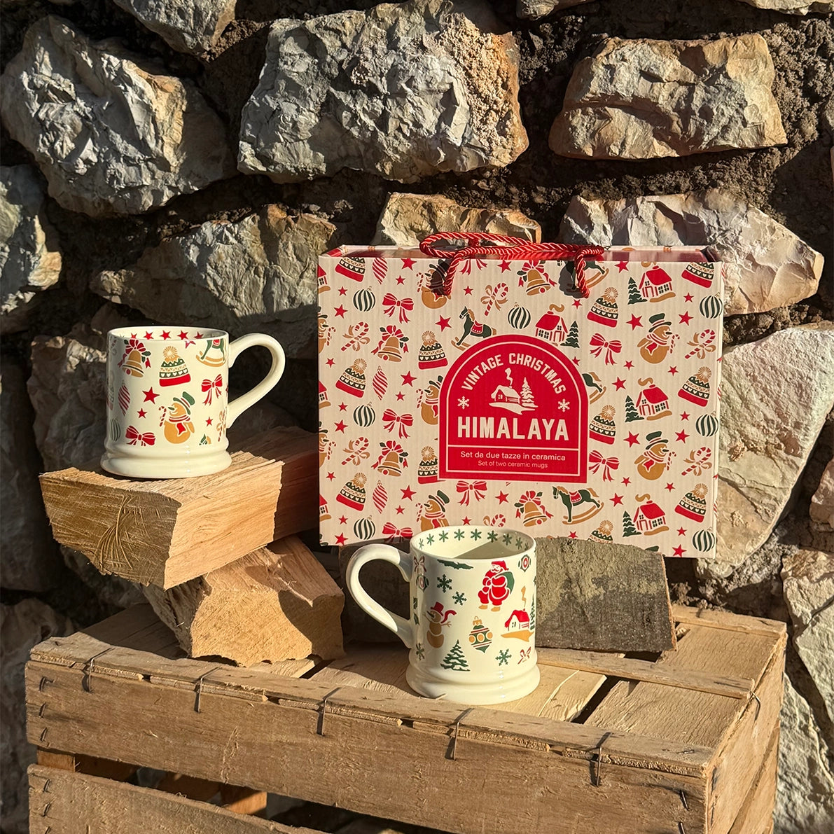 Set composto da due tazze in ceramica decorate con motivi natalizi dallo stile vintage, racchiuse in una confezione regalo in carta con manici in stoffa. Disponibili in due varianti distinte, queste tazze evocano il calore delle feste e sono l'idea perfetta per un regalo di Natale.