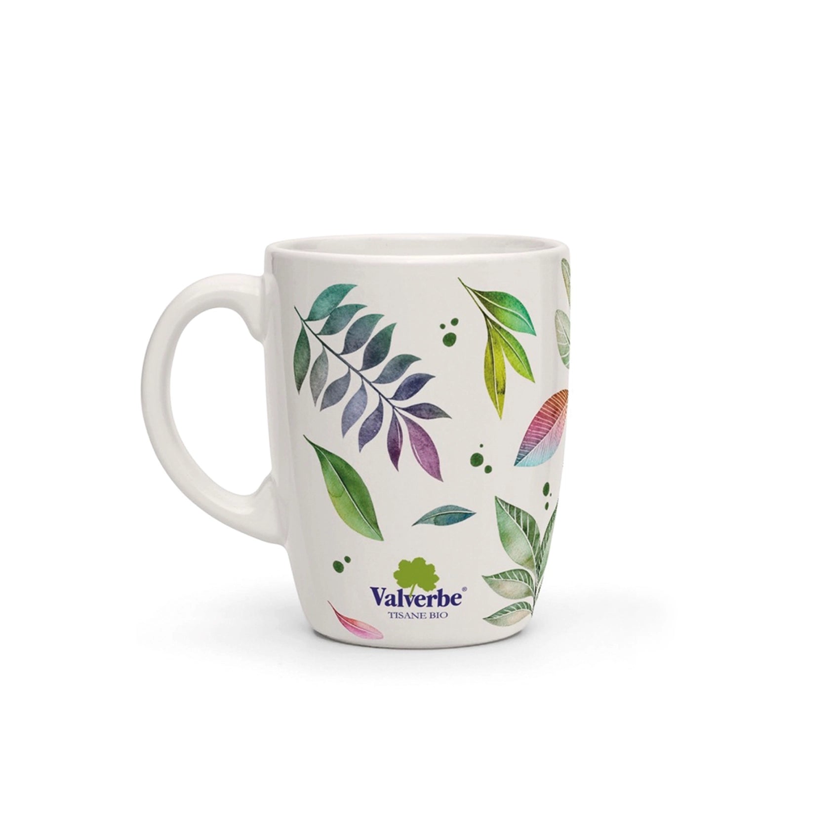 Tazza in ceramica marchiata Valverbe, con finitura lucida che risalta i colori vivaci delle foglie. Perfetta per aggiungere un po’ di colore a una pausa, creando un’atmosfera rilassante e piacevole. Resistente e lavabile in lavastoviglie è ideale per qualsiasi tipo di infuso.