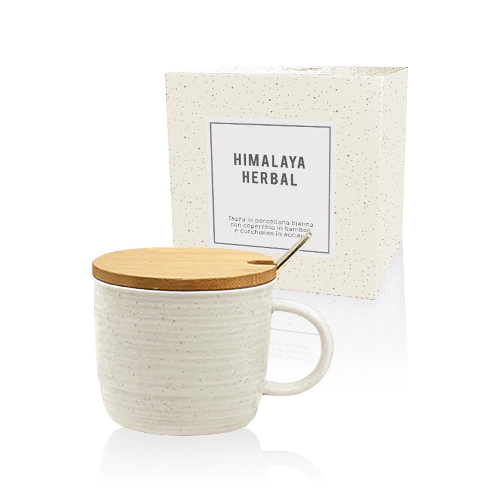 Tazza in ceramica, coperchio in legno e cucchiaino in acciaio. Scatola in carta.