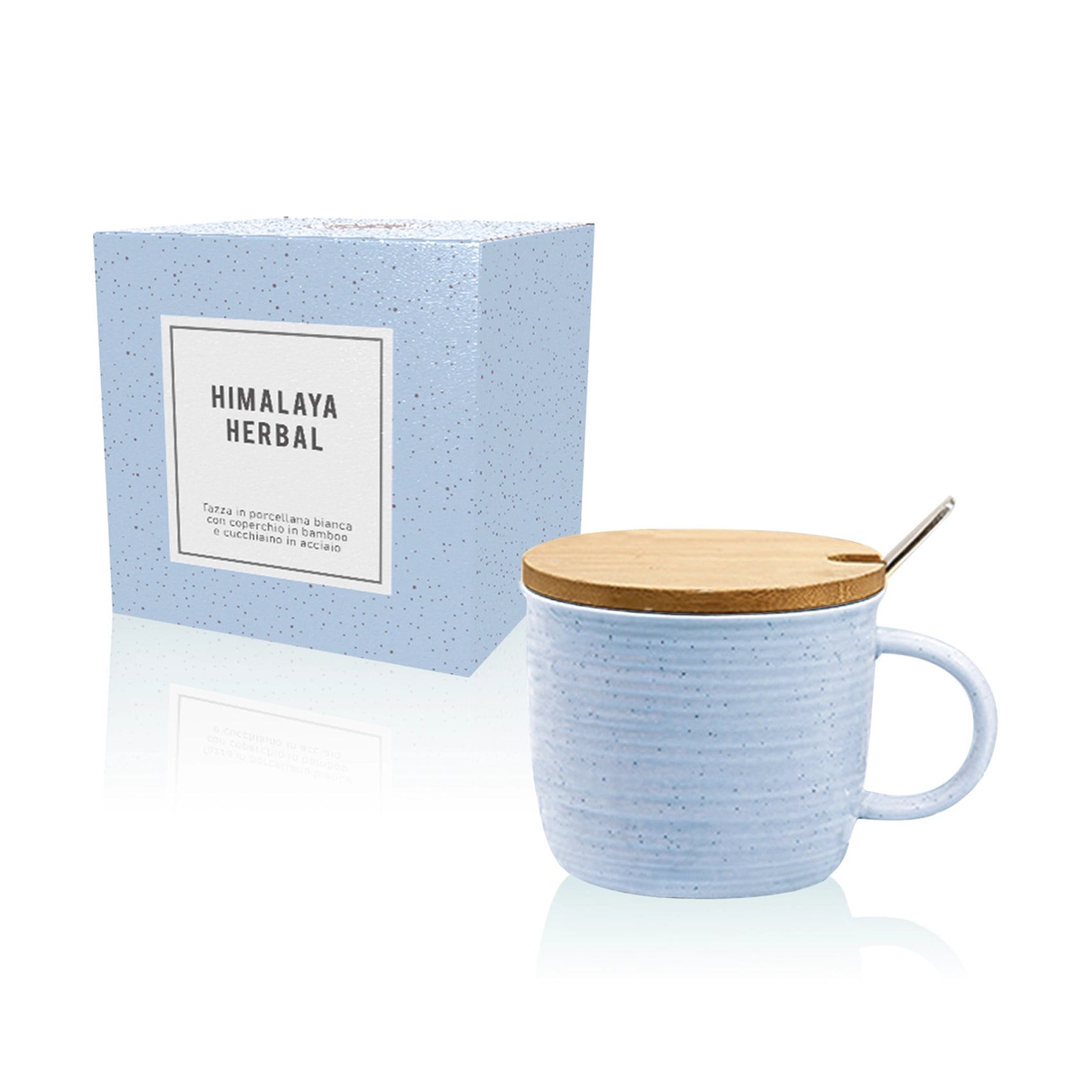 Tazza in ceramica, coperchio in legno e cucchiaino in acciaio. Scatola in carta.