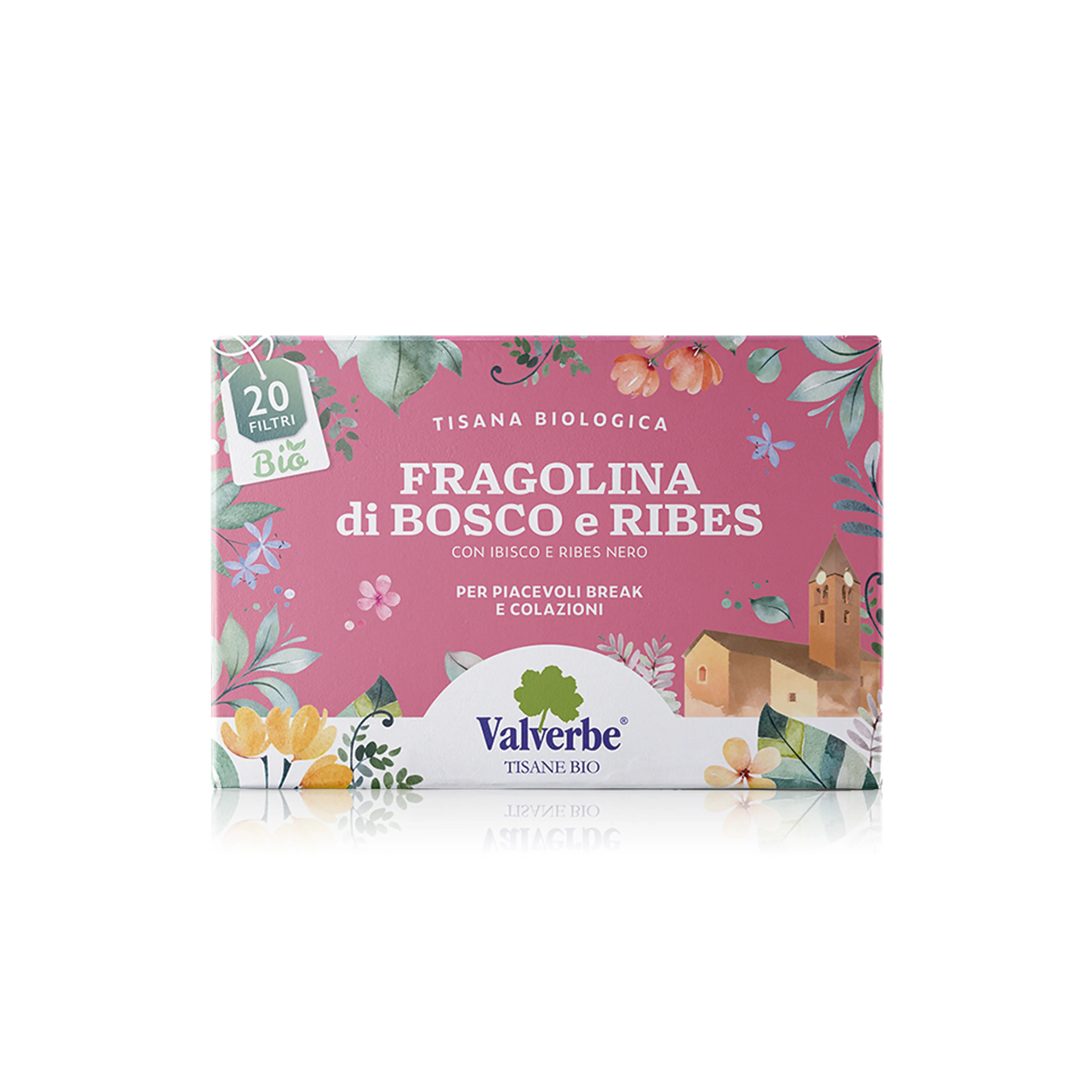 Karkadé (Hibiscus sabdrariffa L.) fiori* 32%, Ribes nero (Ribes nigrum L.) foglie* 25%, Fragola (Fragaria vesca L.) foglie* 15%, Rosa canina (Rosa canina L.) frutti *, Rovo (Rubus ulmifolius Schott) foglie*, Aroma naturale di fragola. [*BIO]