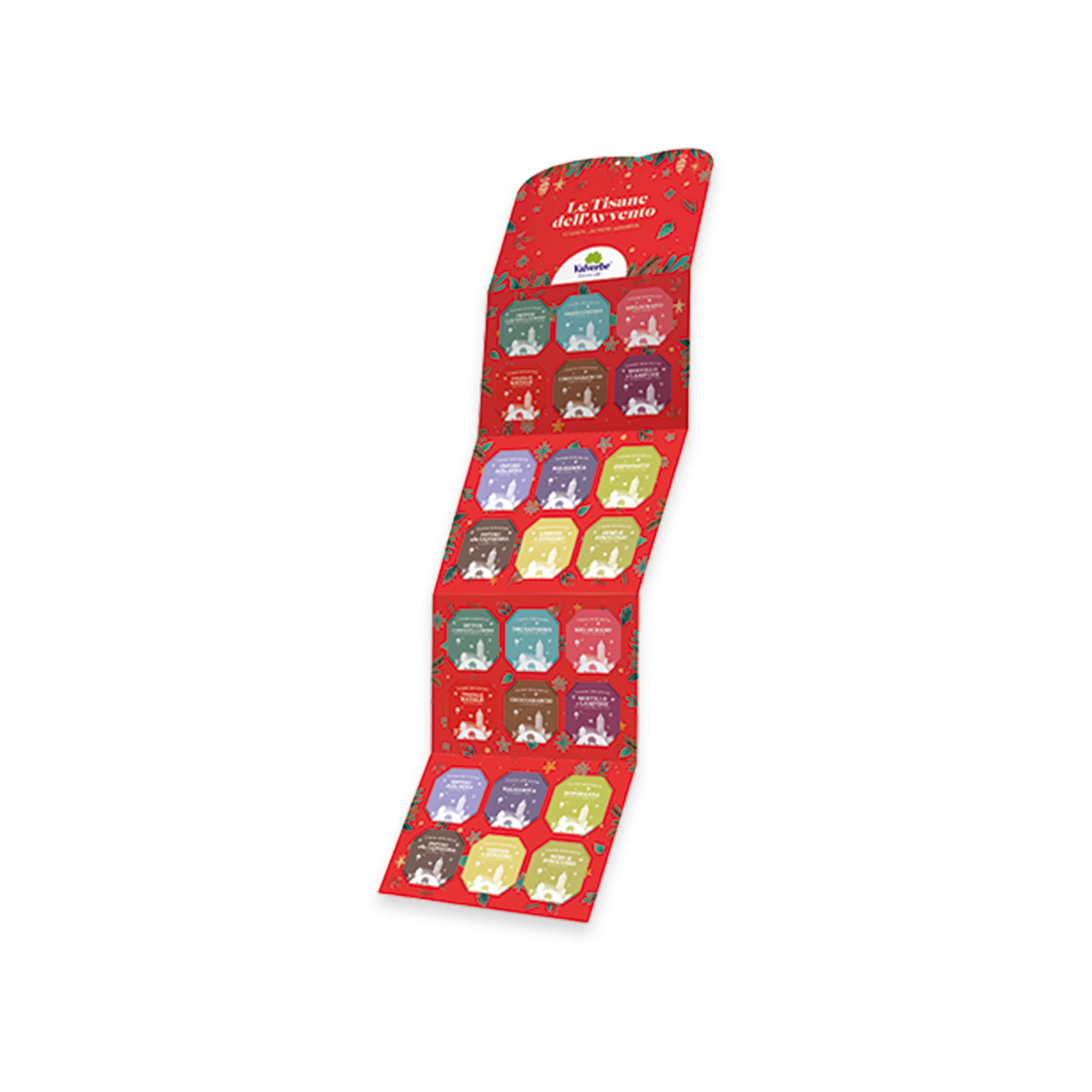 Nella confezione trovi 24 bustine, 2 per ogni gusto, da assaggiare giorno dopo giorno fino ad aprire la bustina “Tisana di Natale” il 24 dicembre. Prodotto confezionato interamente a mano.