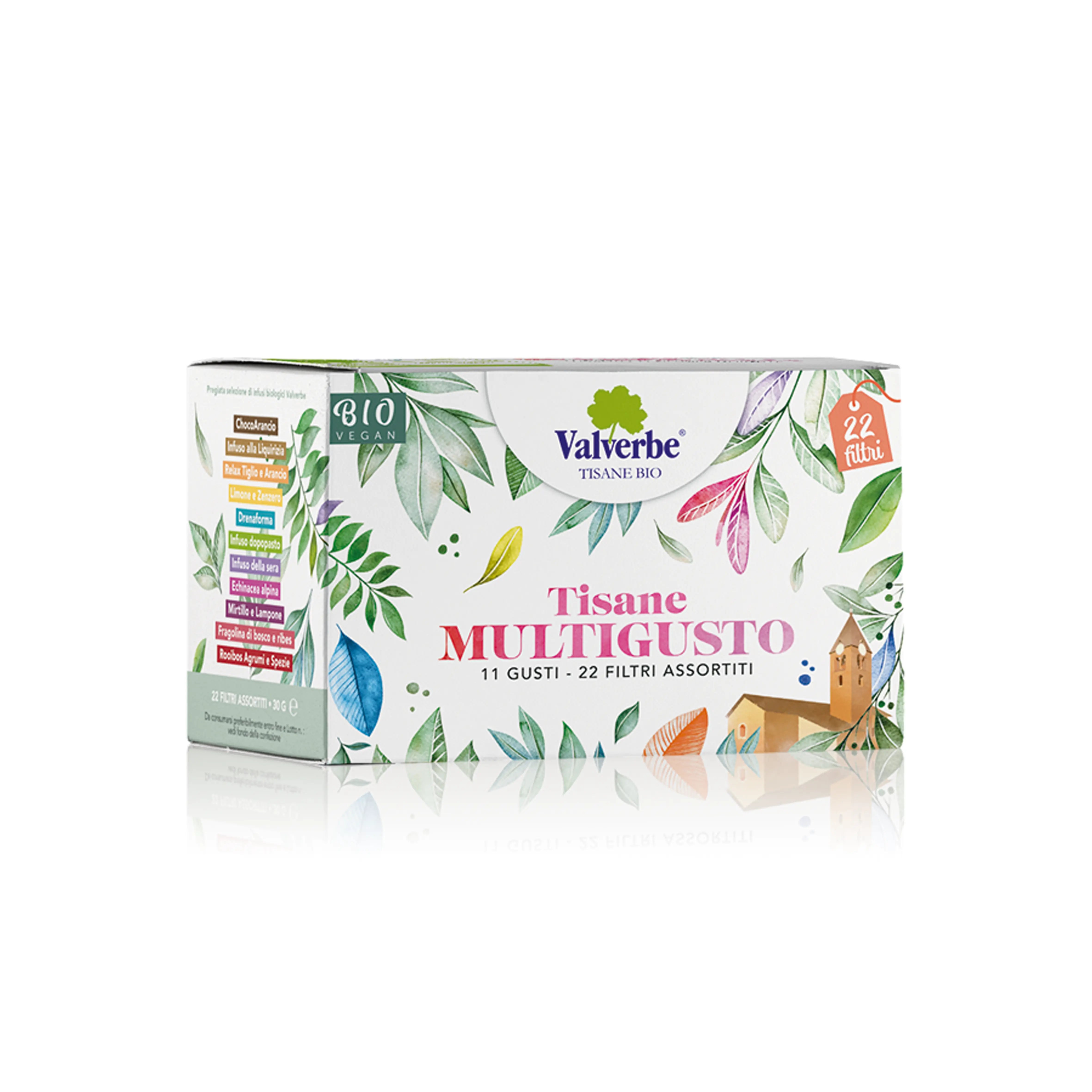 Gusti contenuti all'interno della confezione: Infuso alla Liquirizia, Tisana ChocoArancio, Tisana Relax Tiglio e Arancio, Infuso Limone e Zenzero, Infuso Dopopasto, Tisana Drenaforma, Infuso della Sera, Tisana Echinacea Alpina, Infuso Mirtillo e Lampone, Tisana Fragolina di Bosco e Ribes, Rooibos Agrumi e Spezie.